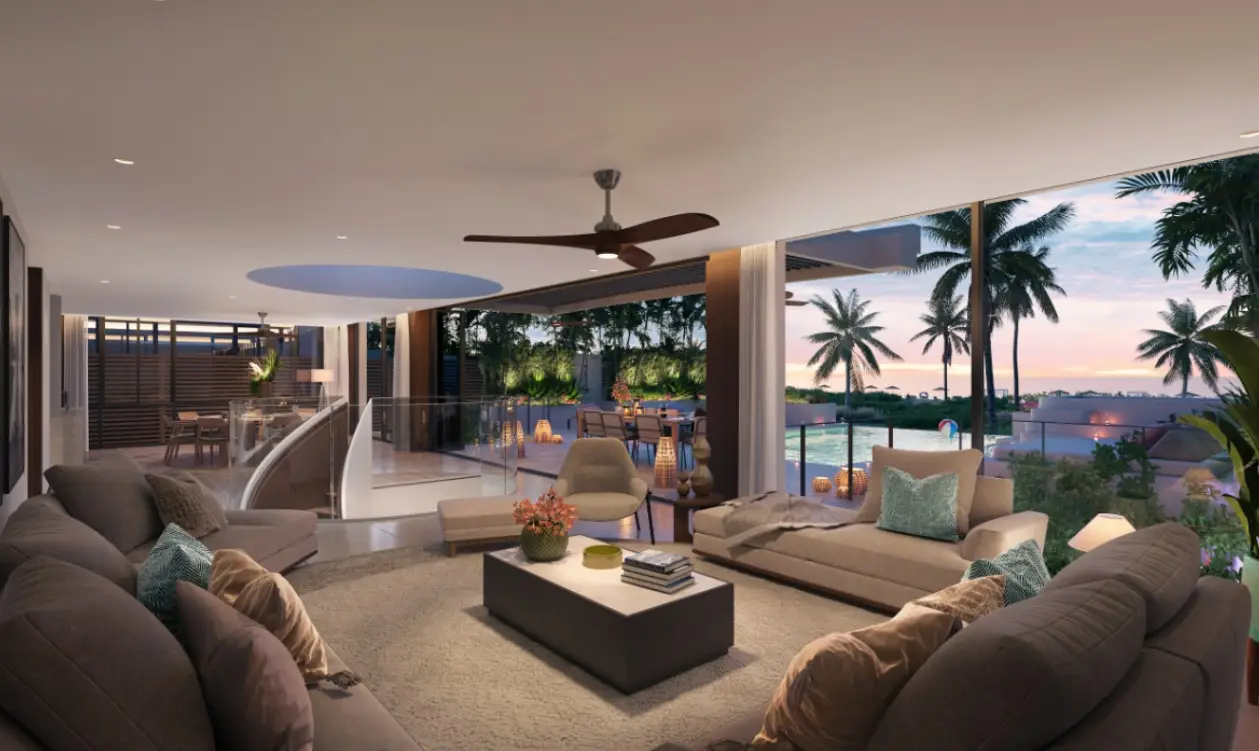 - Комфорт: гостиные с панорамными окнами, спальни с собственными ванными комнатами, просторные террасы и приватные сады