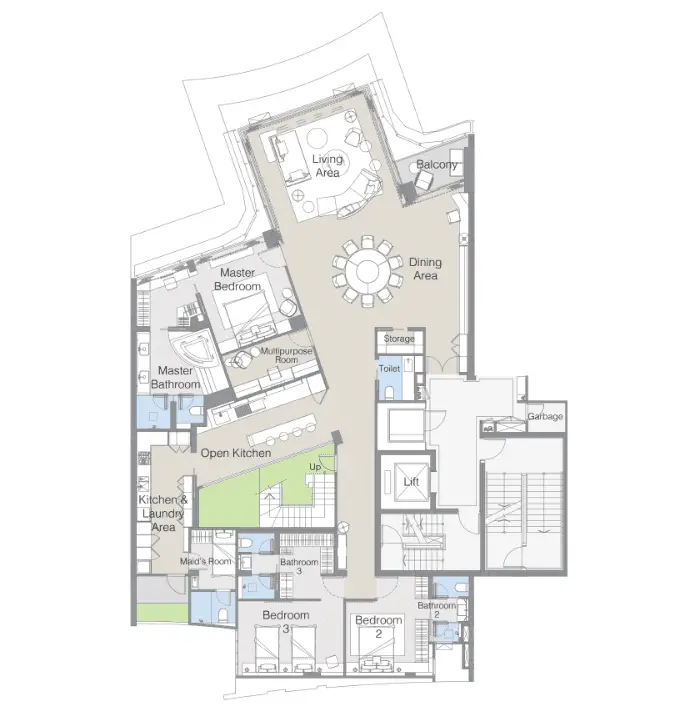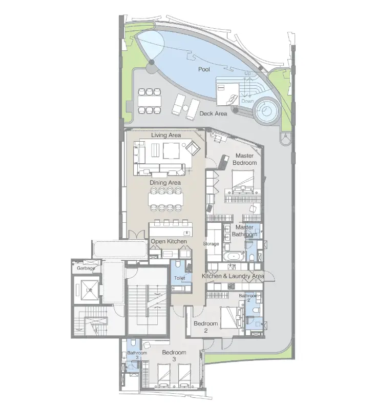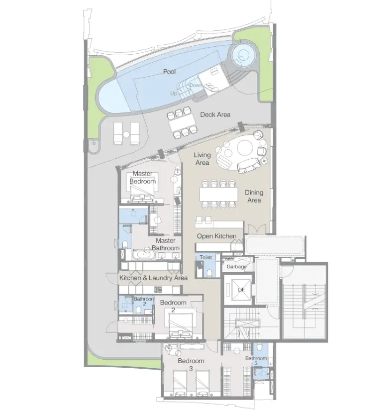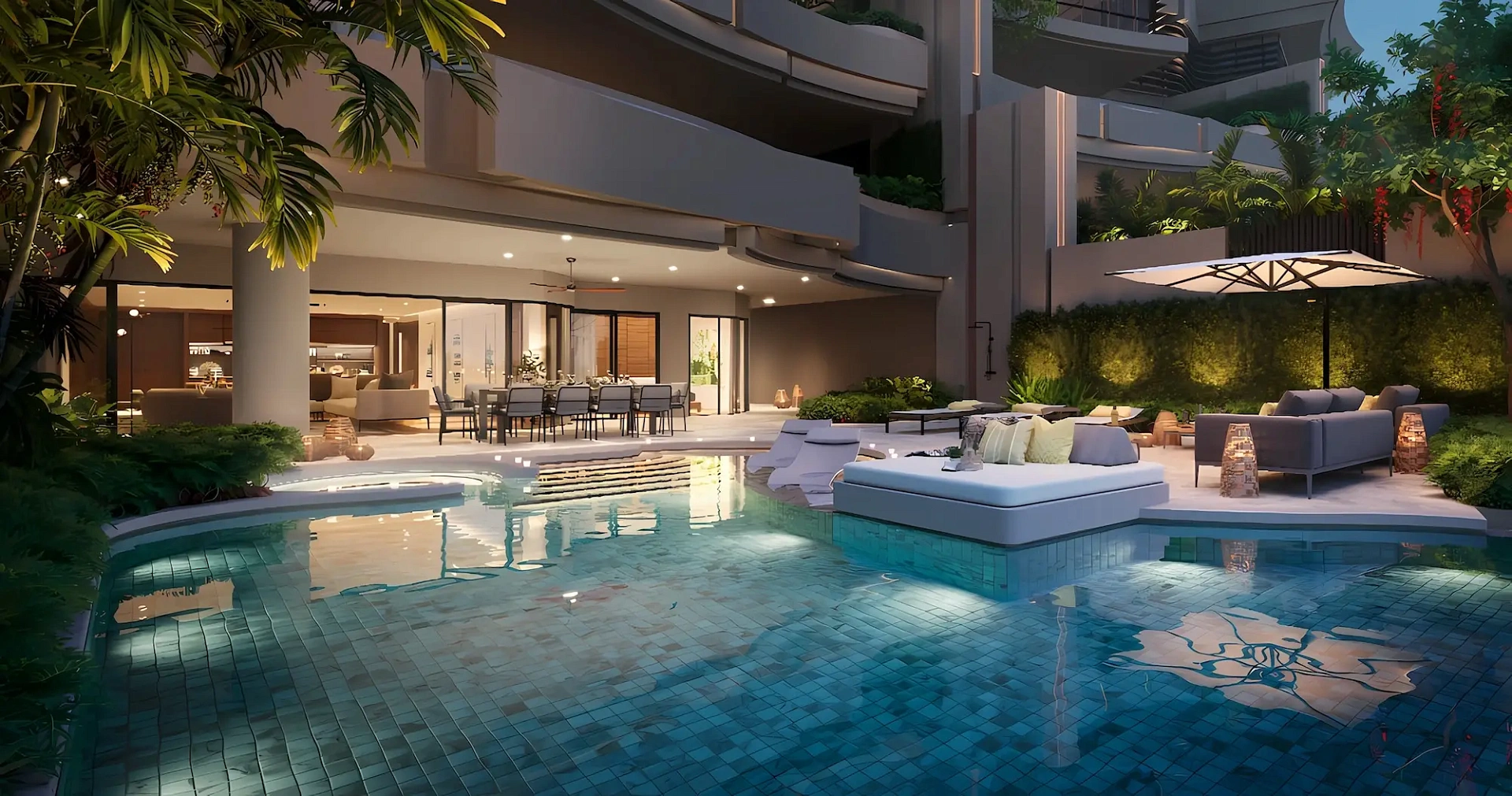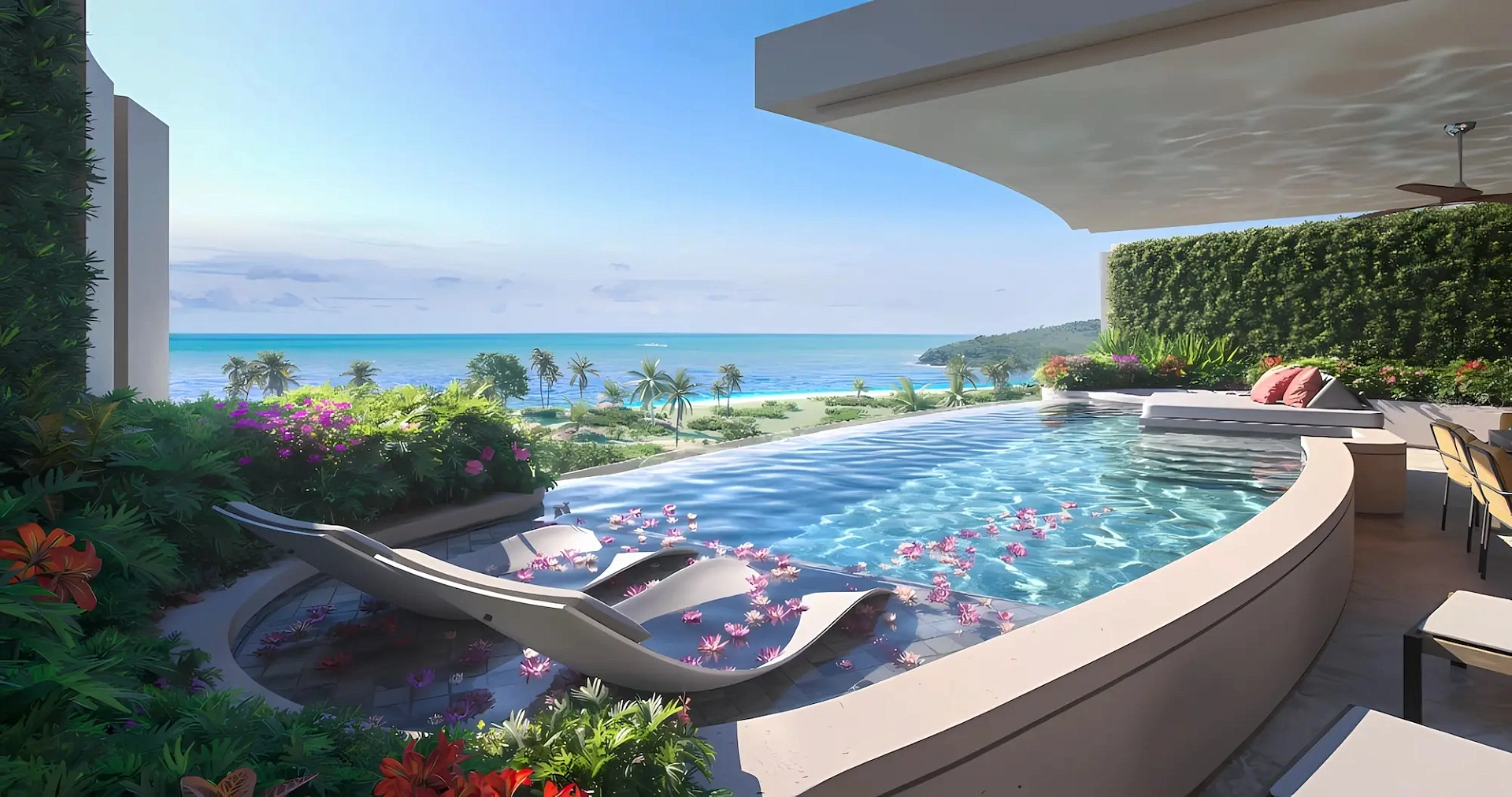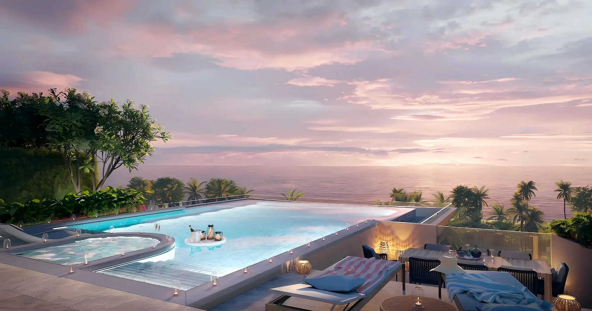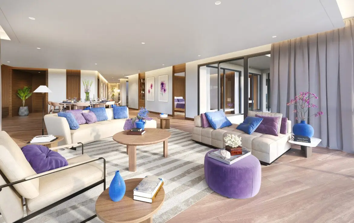 - Типы квартир: просторные апартаменты с 1–3 спальнями, высококачественная отделка, террасы с видом на море и собственные бассейны с гидромассажем