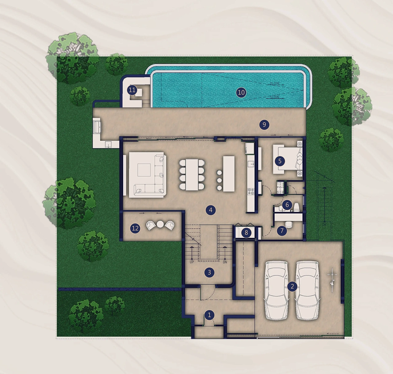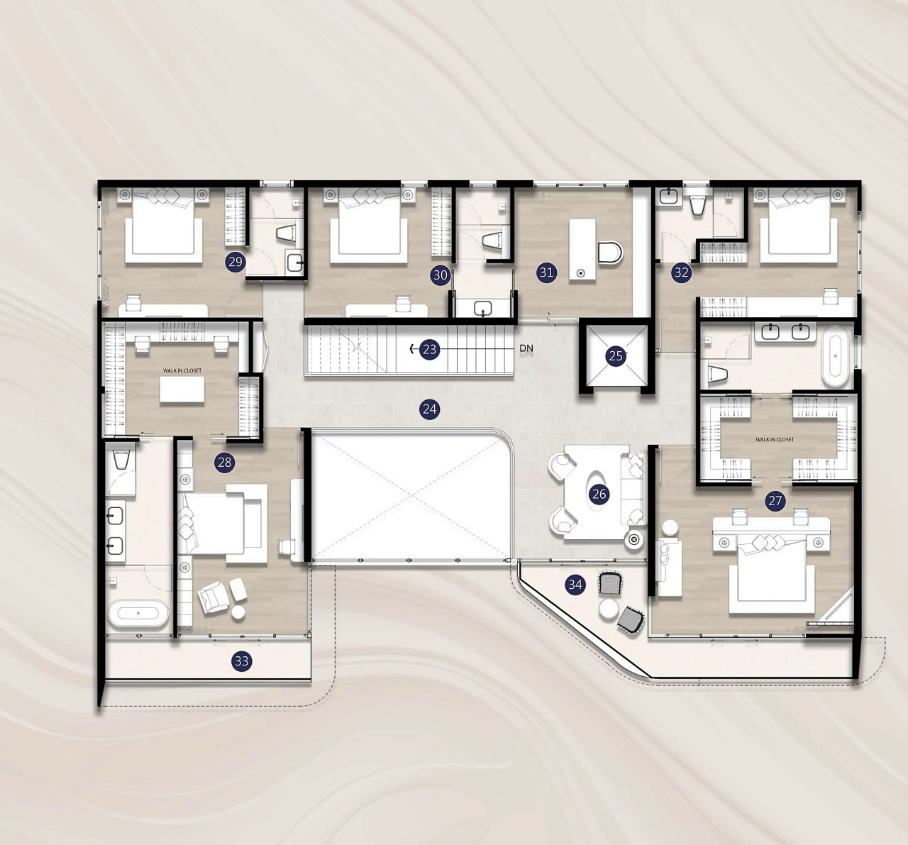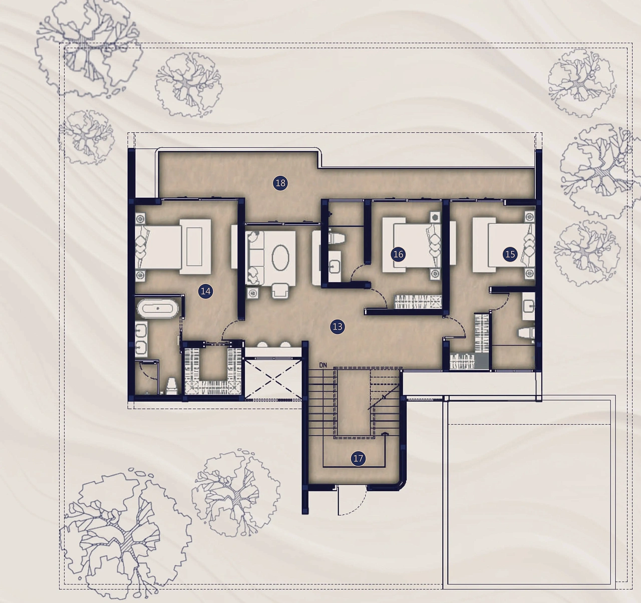 В комплексе находится 33 просторных светлых виллы (от 343 м²) с 3–5 спальнями, в минималистичном ультра-современном дизайне. Каждая роскошная вилла имеет собственный бассейн и парковку на 2-3 авто. Уникальный бонус — прямой доступ к элитной инфраструктуре школы (профессиональному футбольному полю, бассейнам и детским площадкам)! -