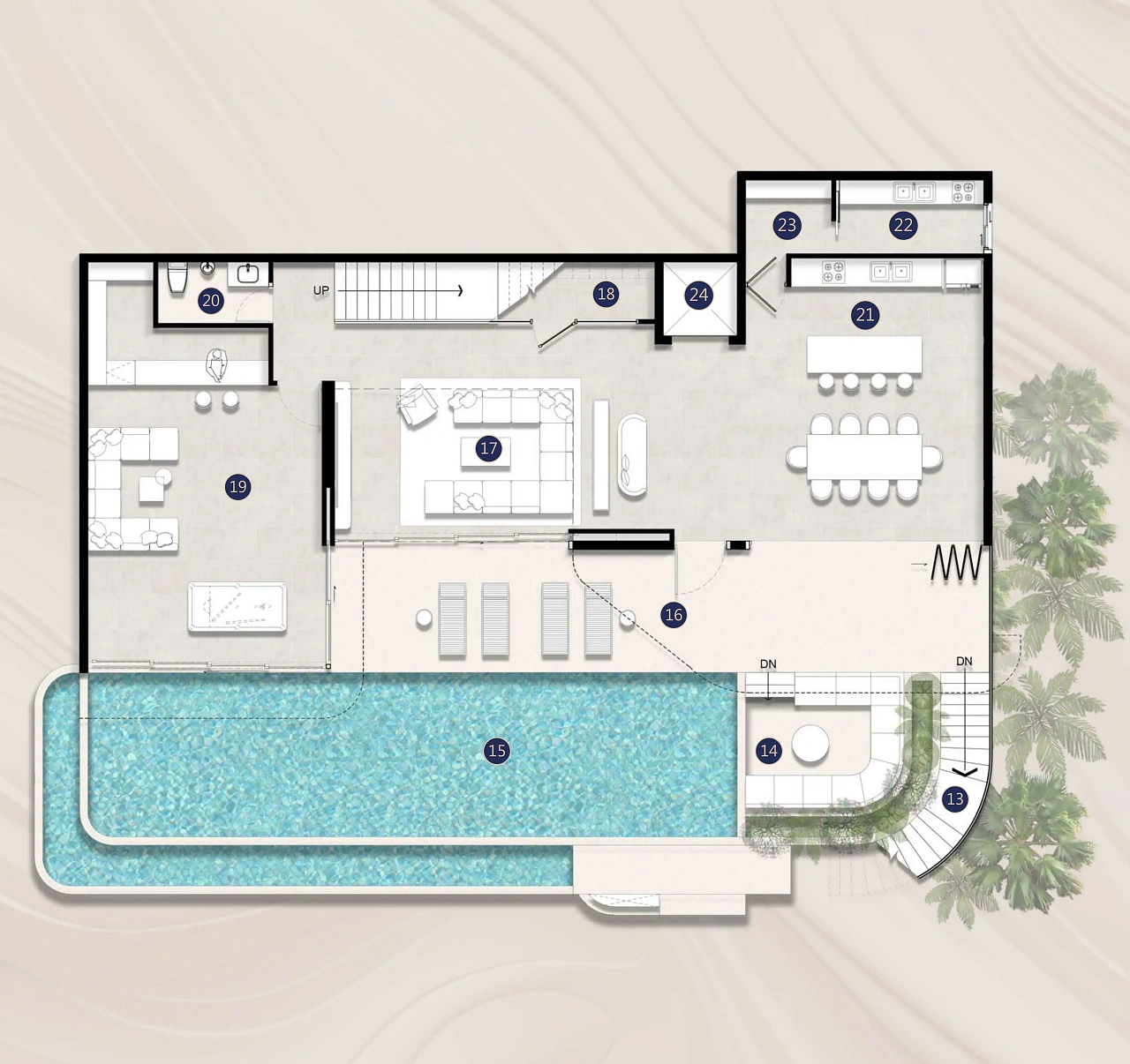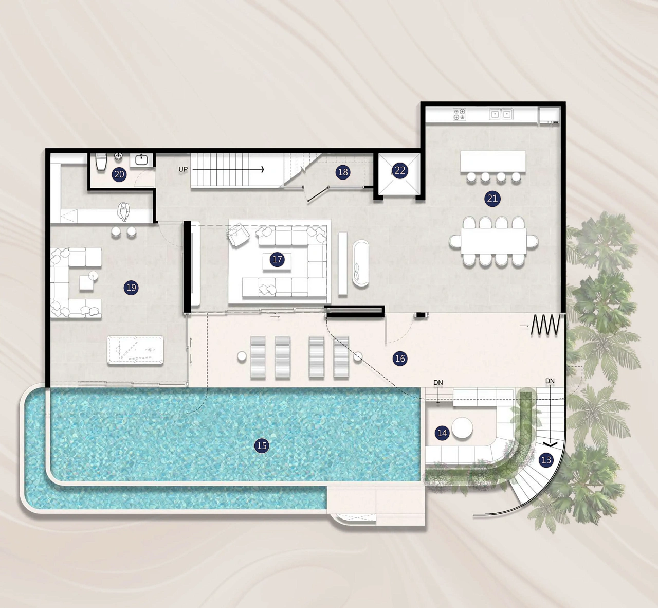 Застройщик предлагает полностью укомплектованные люксовые пакеты мебели и декора: от 3,5 млн бат для крутых вилл типа Tropica и до 4,5 млн бат для огромных вилл Oceana. Как и во многих проектах данного класса, при вашем желании можно застроить свободный участок гостевой виллой всего за 1 млн бат.