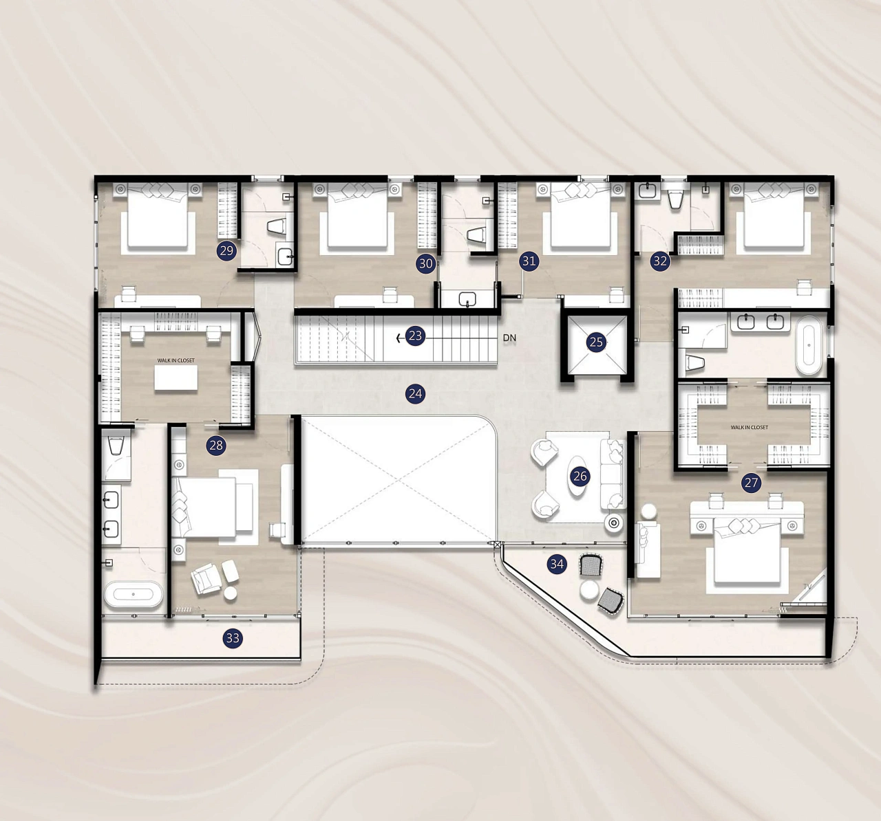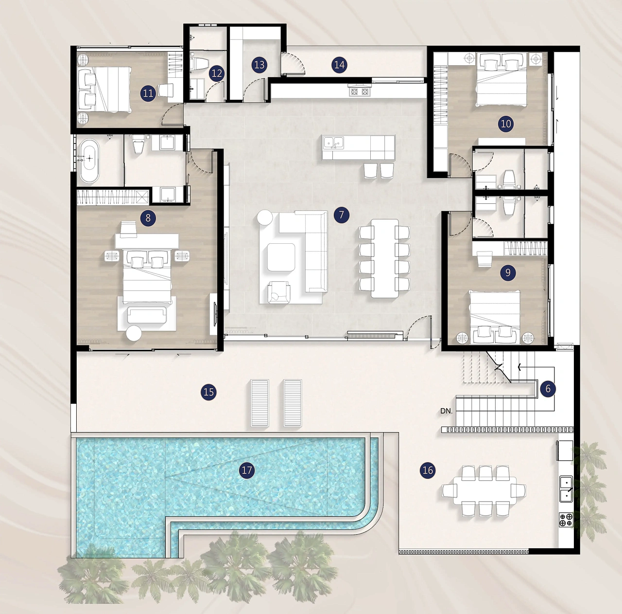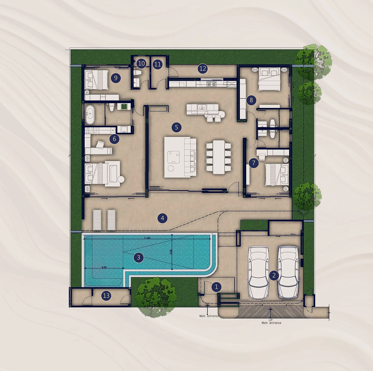 - Типы вилл: 33 просторные виллы с 3–5 спальнями