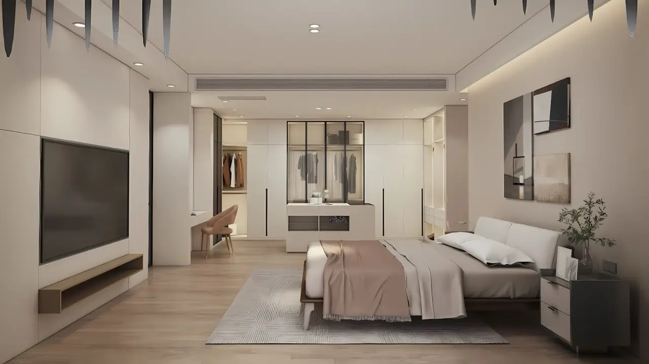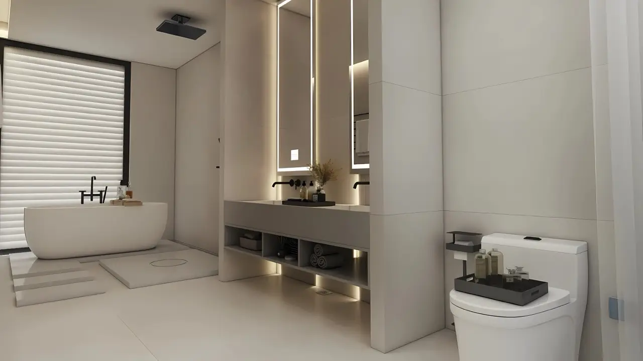 - Полностью укомплектованный интерьер: встроенные шкафы, шторы, ванные комнаты с раковинами, зеркалами, душевыми зонами и сантехникой