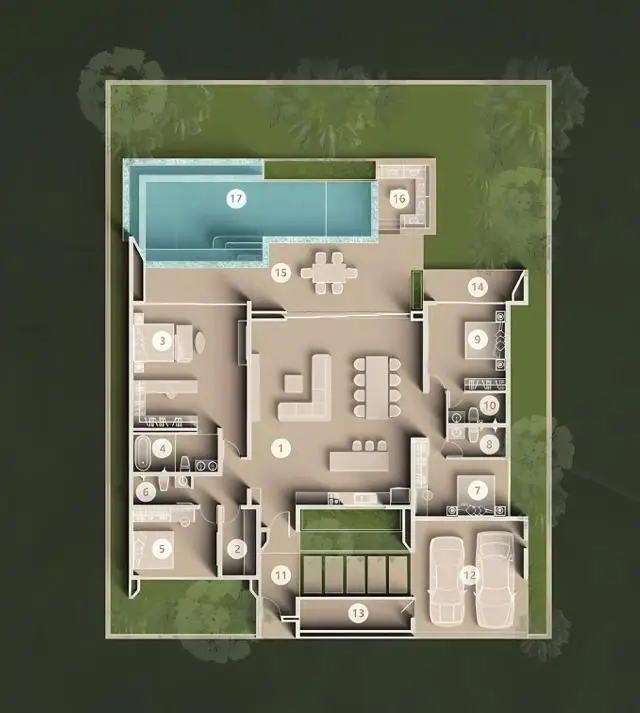 - Типы вилл: 33 просторные виллы с 3–5 спальнями