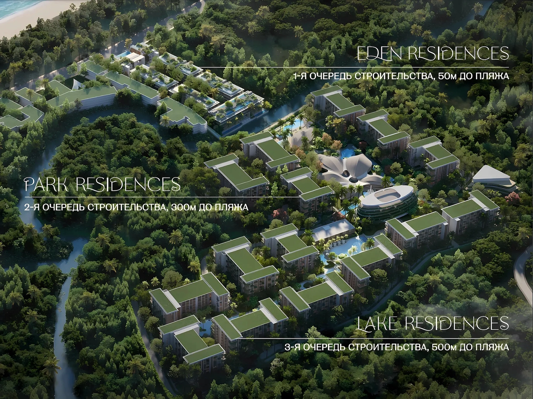 - Природная интеграция: 122,000 м² территории, где 70% занято парками, озерами и садами, создающими гармоничную среду.