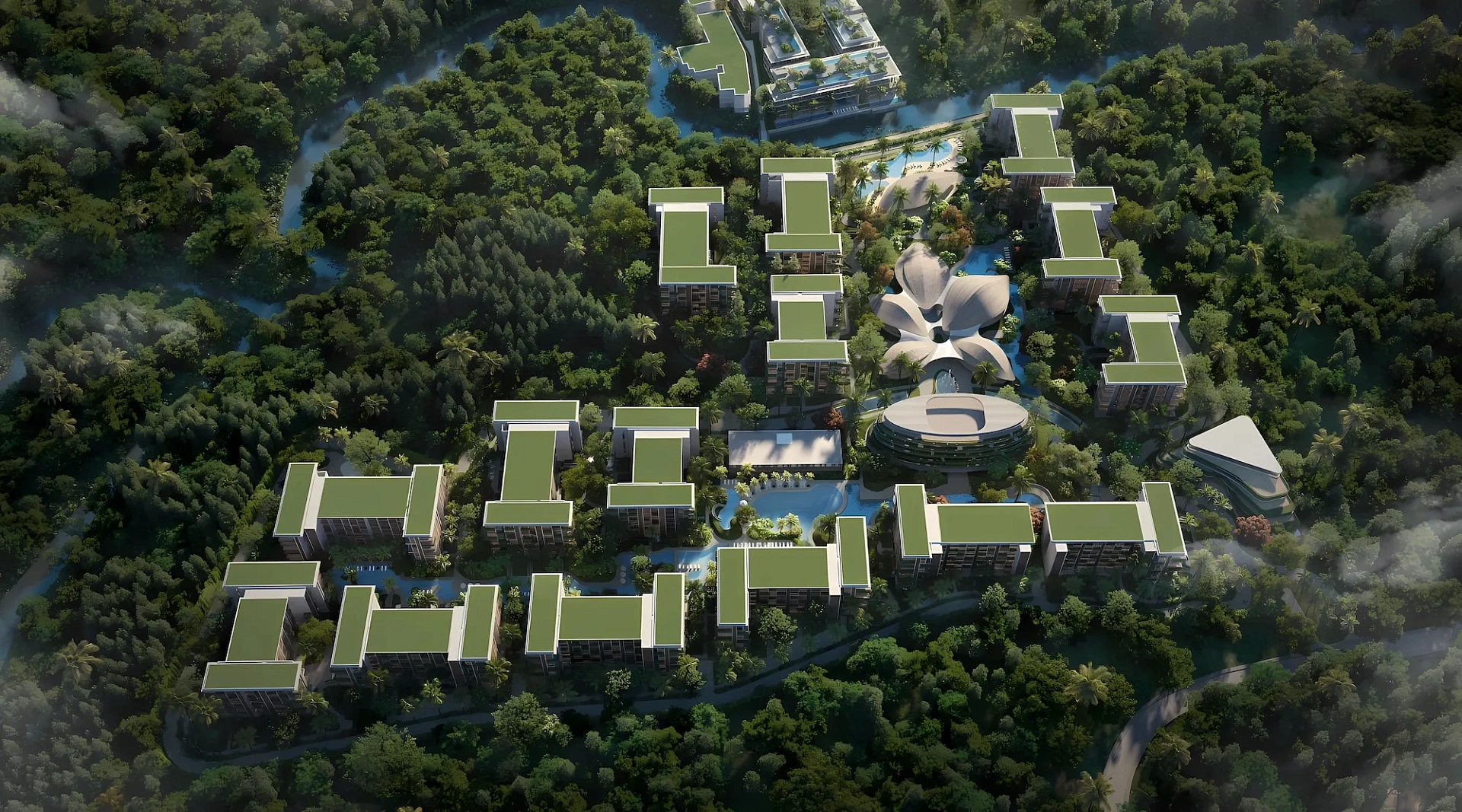 Особенности: Площадь 122,000 м² (70% — парки, озера, сады), спа, тренажерный зал, йога-студии, медитативные сады
