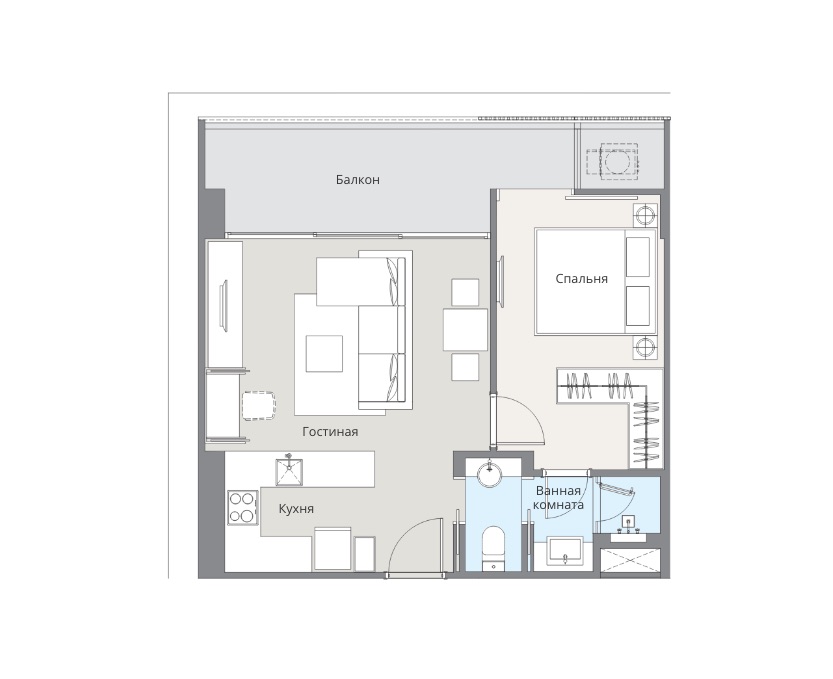 - Встроенная кухня с базовой техникой (плита и вытяжка)