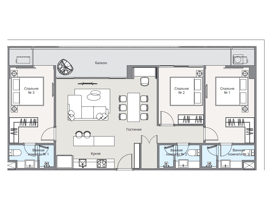 - Встроенная кухня с базовой техникой (плита и вытяжка)
