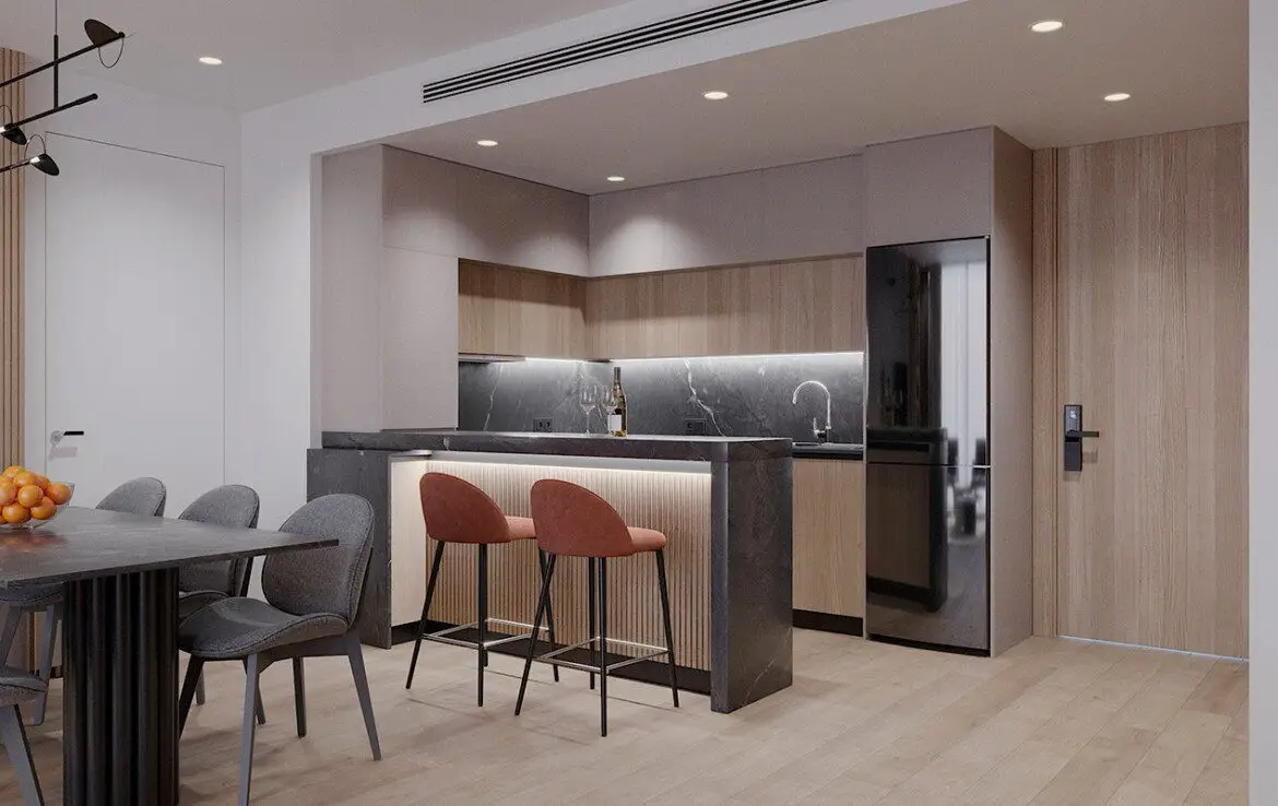 - Встроенная кухня с базовой техникой (плита и вытяжка)