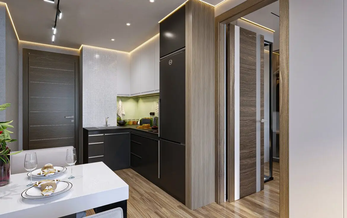 - Встроенная кухня с базовой техникой (плита и вытяжка)