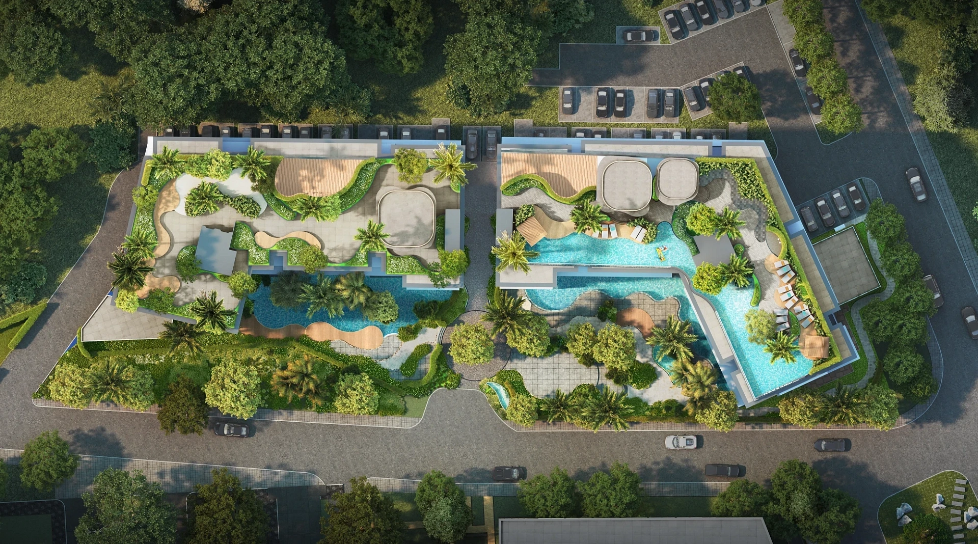 - Инфраструктура: 5 бассейнов (включая rooftop), 2 pool-бара, 3 ресторана + rooftop-ресторан, фитнес-центр, йога-зал, indoor/outdoor kids club, мини-маркет, сады, ресепшн, парковка, CCTV и охрана 24/7.