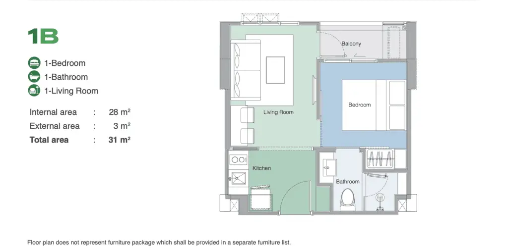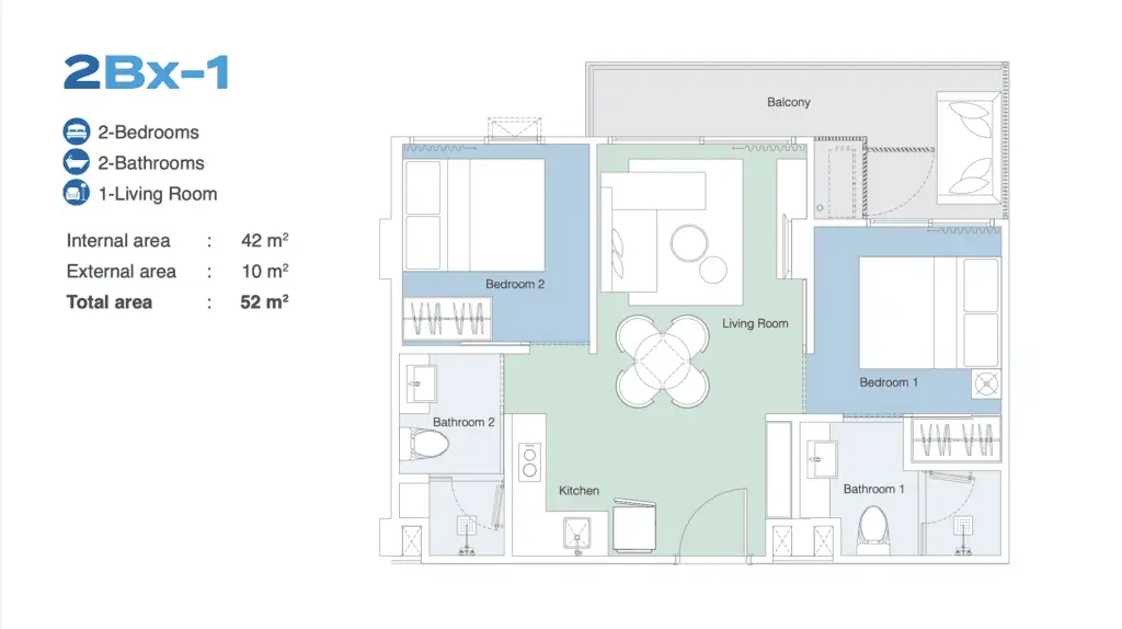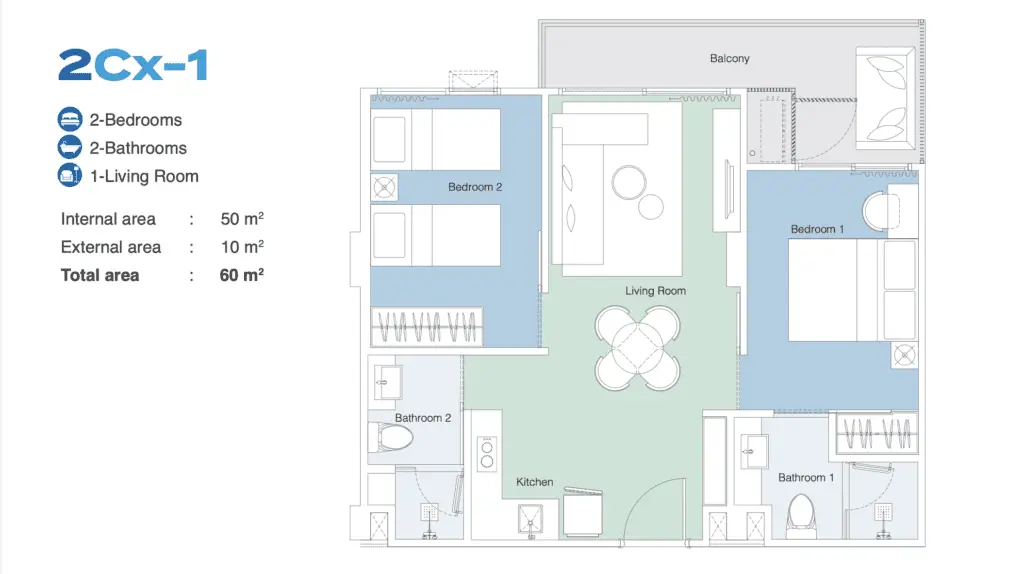 Ежегодное обслуживание составит всего 50 бат за м² в месяц. Специальный взнос в развитие и фонд района — 100 бат/м² в год. А стоимость красивого полного пакета фирменной люкс-мебели с техникой от застройщика для студий и 1-спальных обойдется в 450,000 бат, а для просторных 2-спальных квартир — в 600,000 бат.