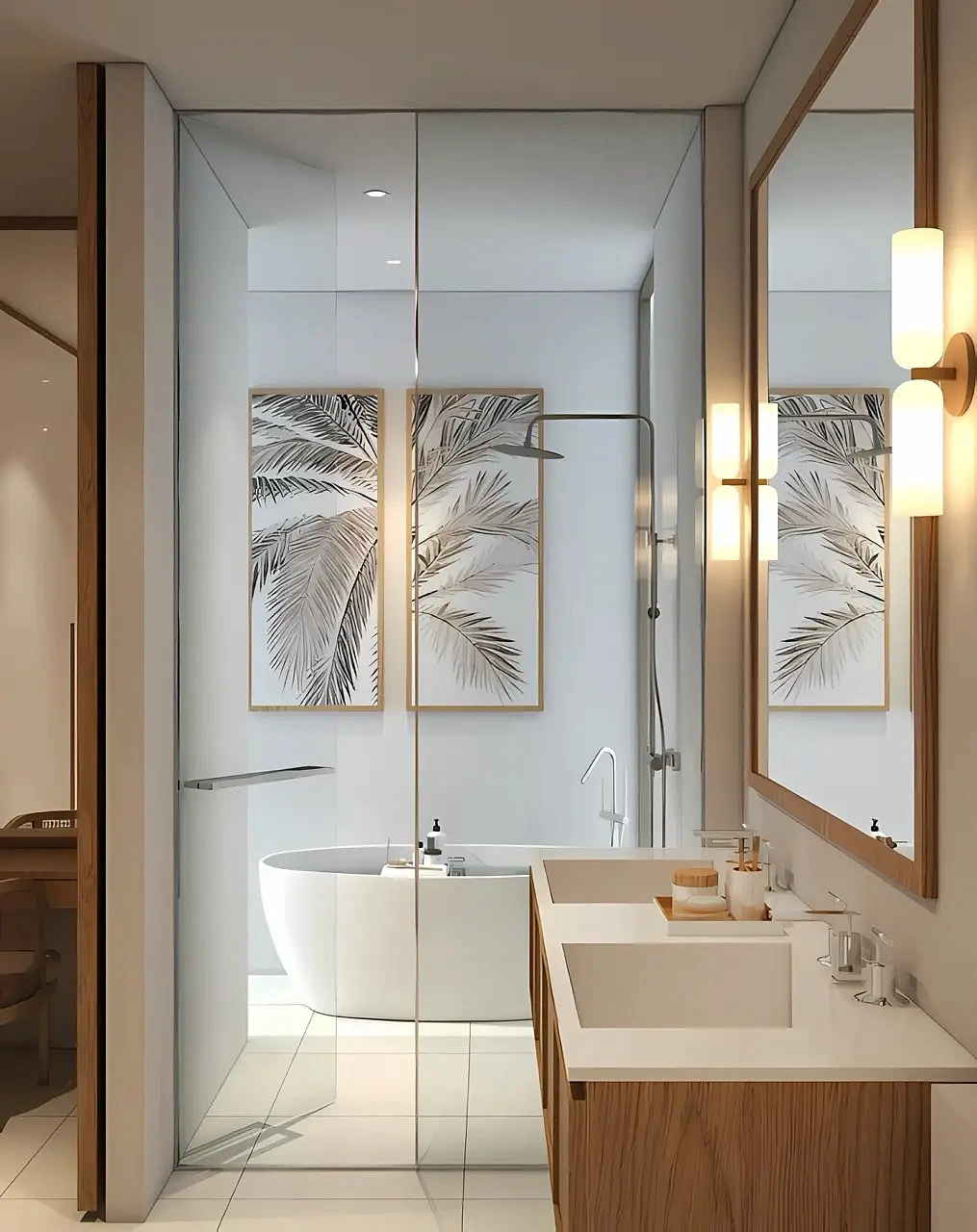 - Полностью укомплектованный интерьер: встроенные шкафы, шторы, ванные комнаты с раковинами, зеркалами, душевыми зонами и сантехникой