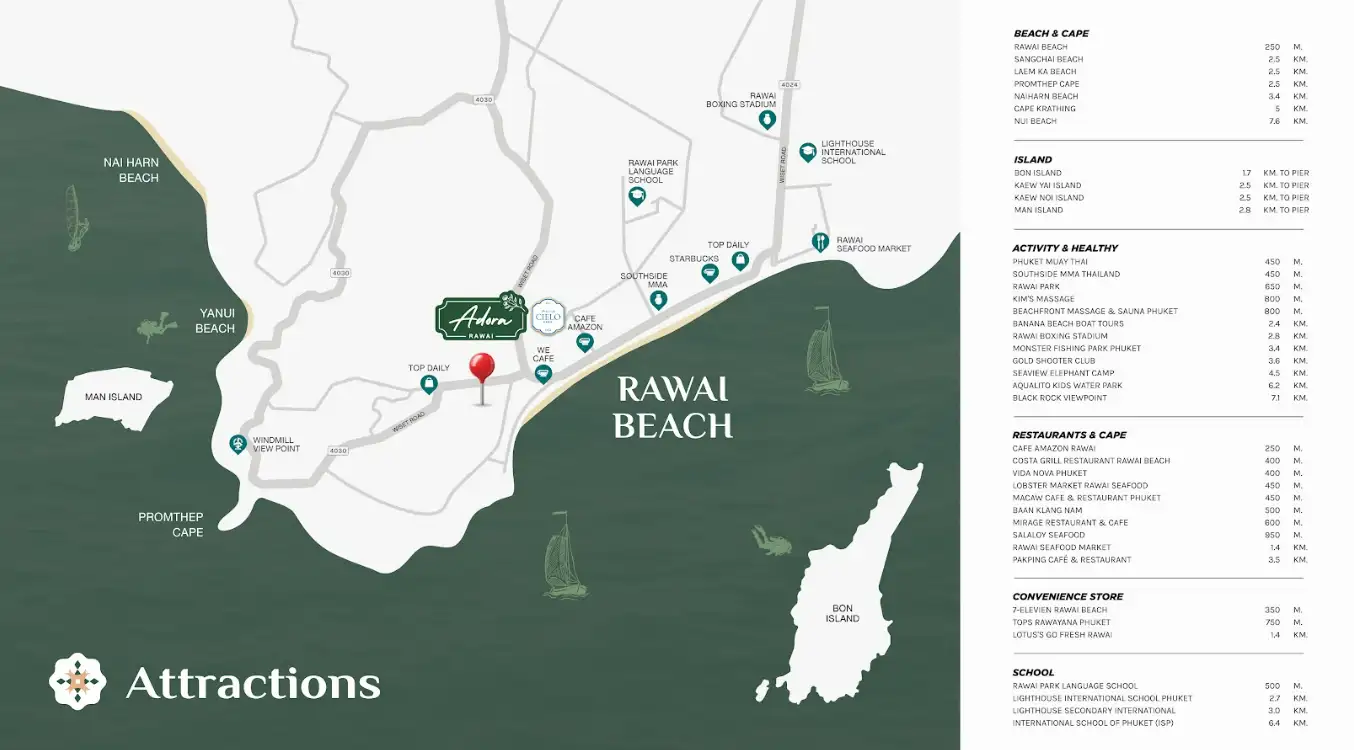 Комплекс Title Adora Rawai находится в окружении пляжей, ресторанов, торговых галерей и закрытых клубов.
