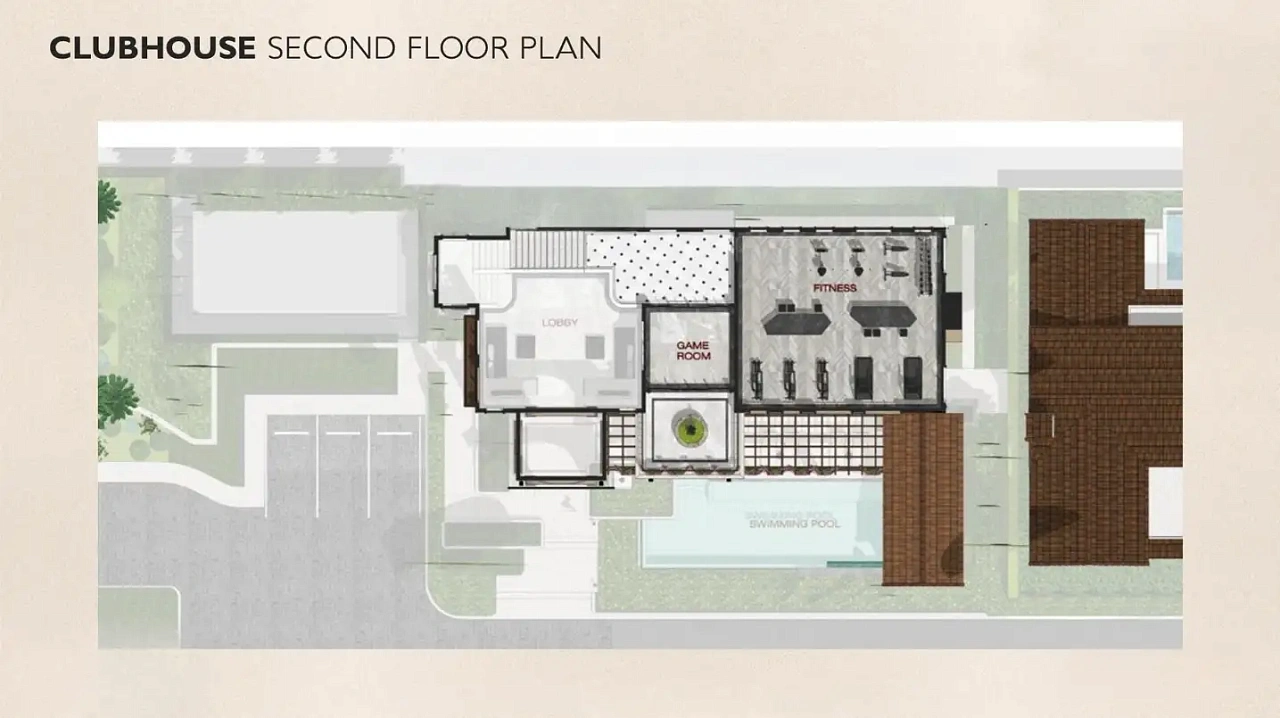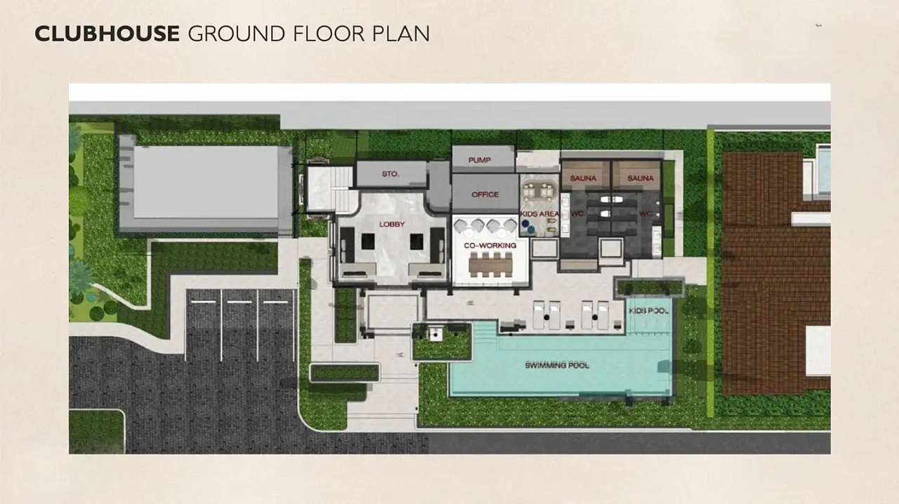 Клубхаус с indoor: лобби, co-working, детская комната, сауна, фитнес, игровая. Outdoor: терраса, бассейн, детский бассейн. Зеленые зоны: главный сад и площадка 1,168 sq.m., карманные сады 490 sq.m.