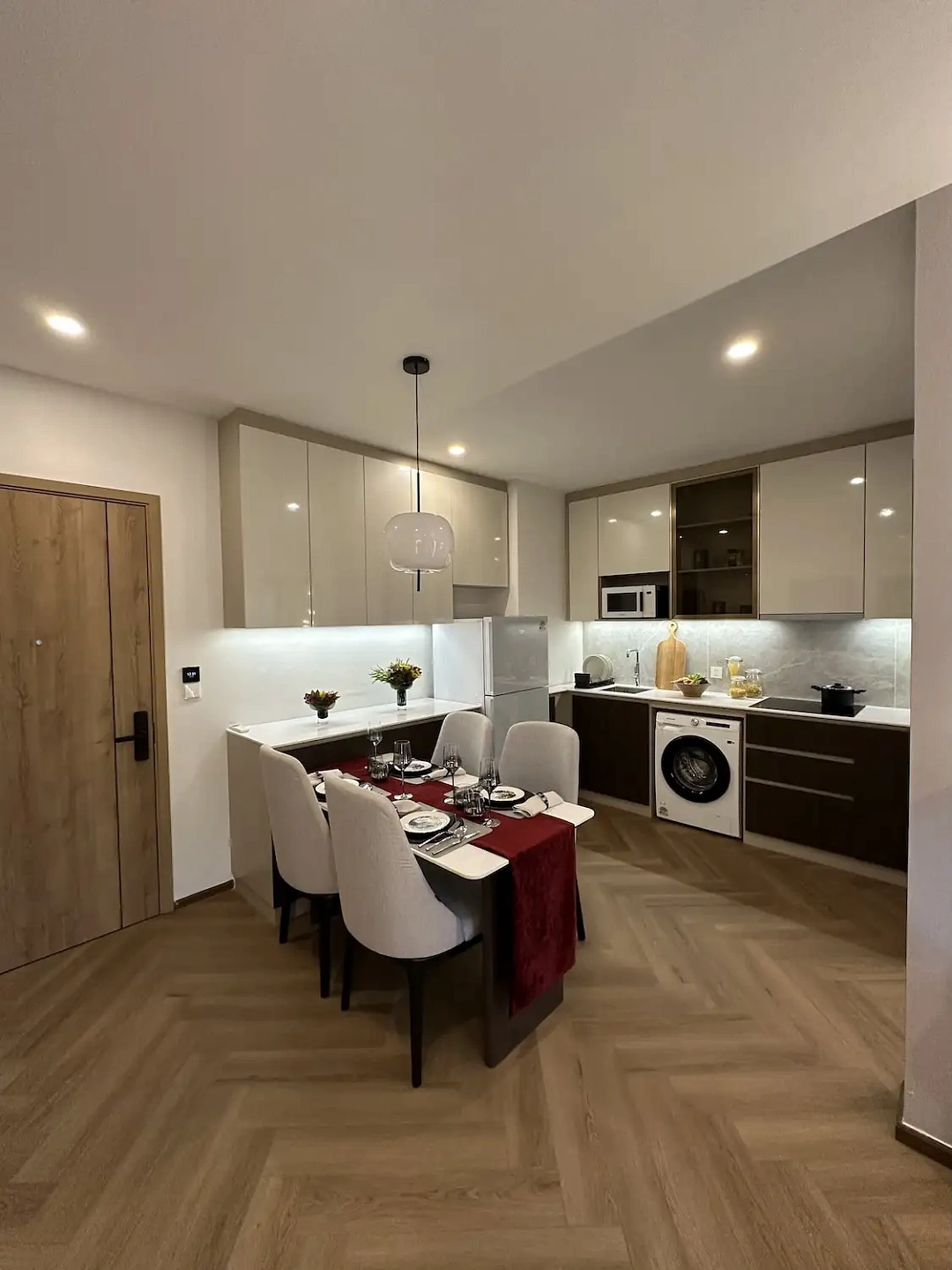 - Встроенная кухня с базовой техникой (плита и вытяжка)