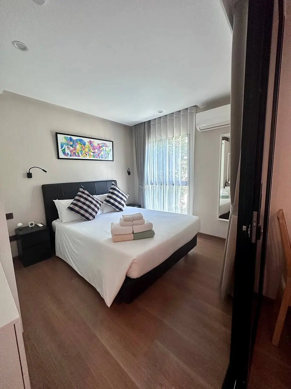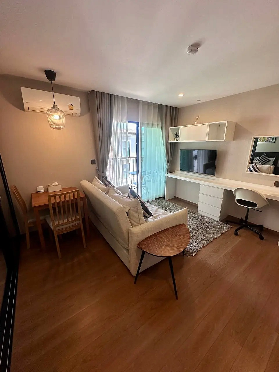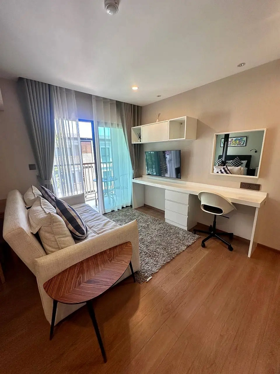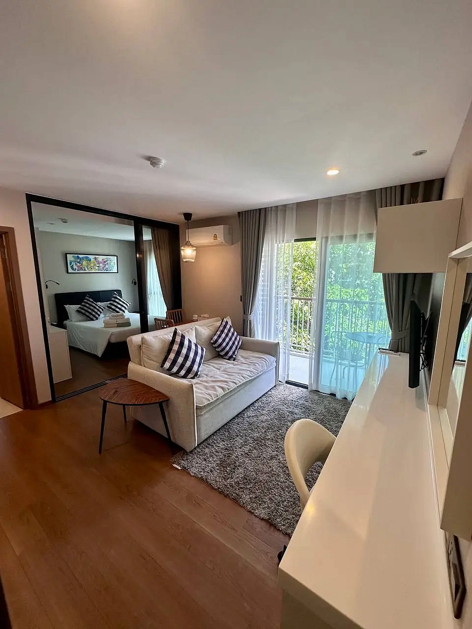 The Title V – Y413 – 1-bedroom (36 м²) — квартира в корпусе Y жилого комплекса The Title V на юге острова, всего в 300 метрах от пляжа Раваи. Расположена на 4 этаже, с балконом и видом на бассейн. Полностью меблирована в скандинавском стиле с элементами минимализма, светлые тона, продуманная планировка.