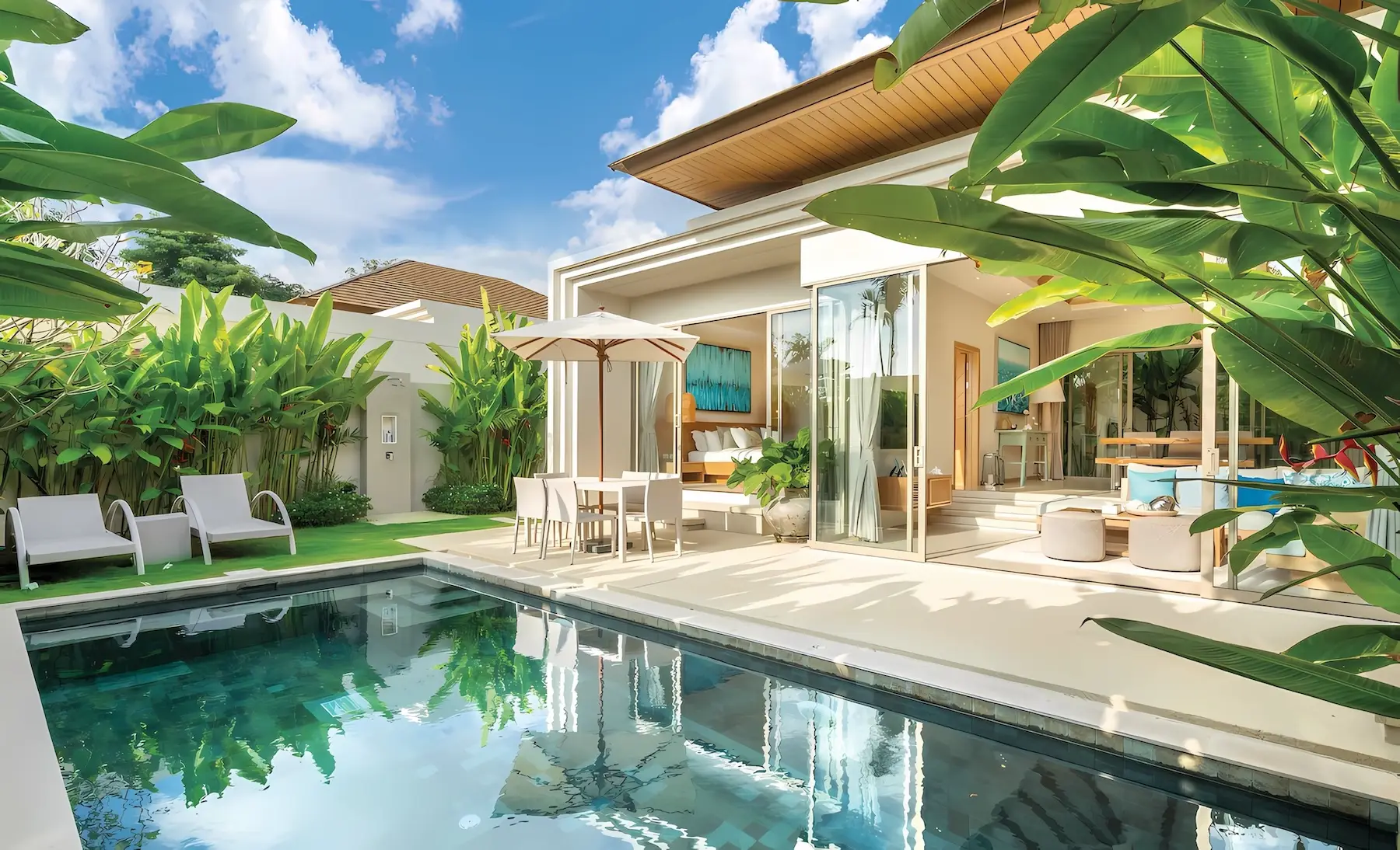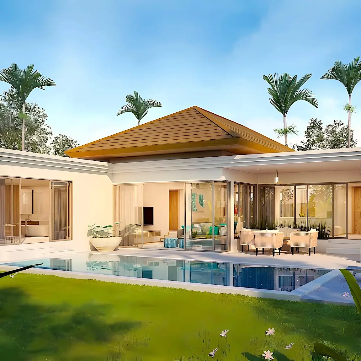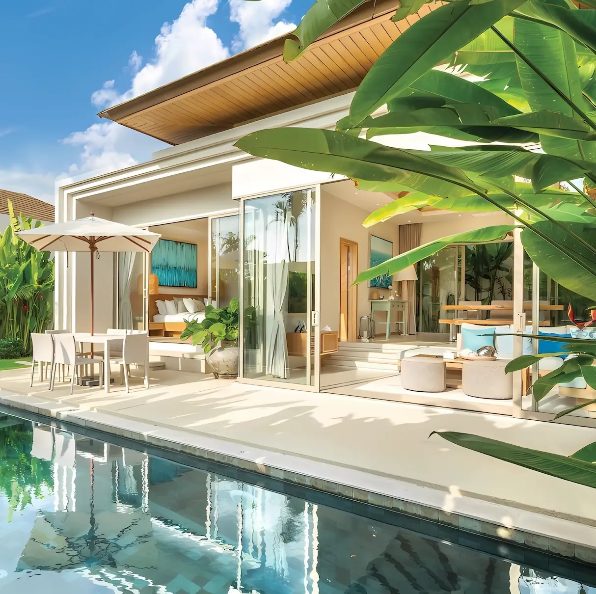 Trichada Essence — коллекция премиальных одноэтажных вилл с бассейнами в тропических садах на западном побережье Пхукета, объединяющая приватность, комфорт и современный стиль.