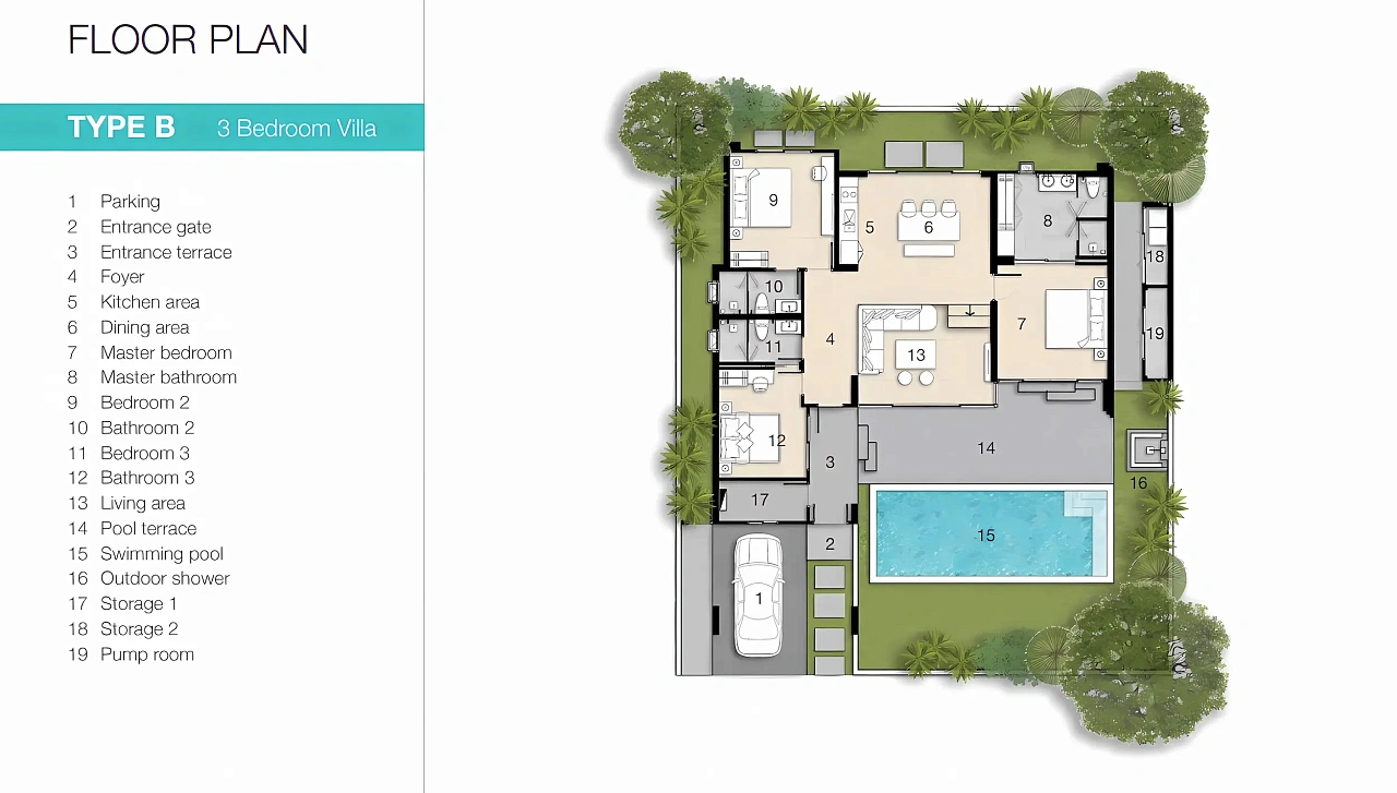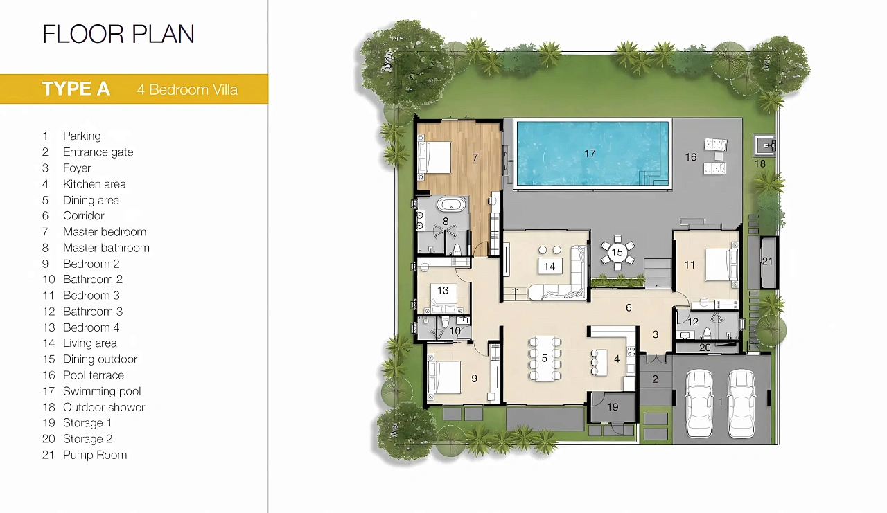 - Типы вилл: 3–4 спальни с частным бассейном, террасой и садом