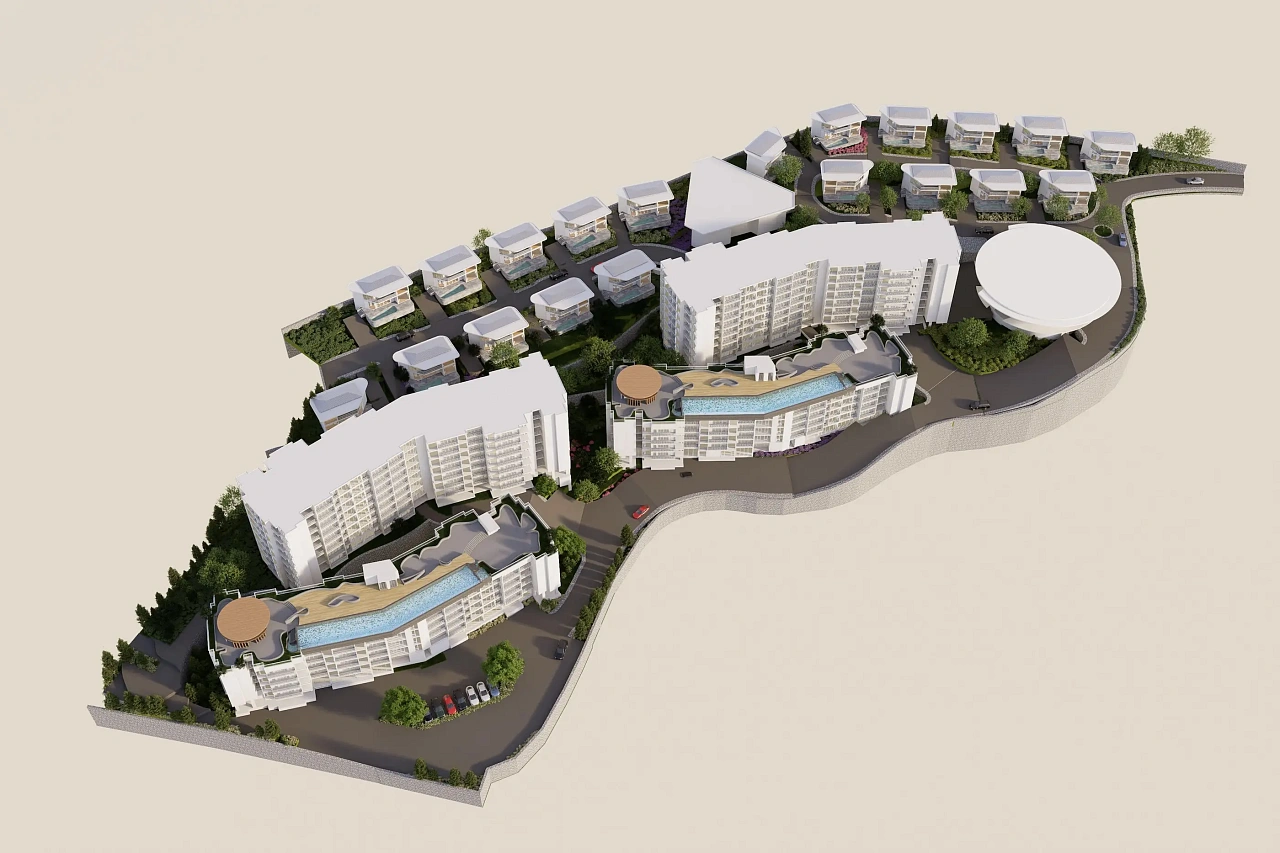 - Эксклюзивные апартаменты: Полностью меблированные студии, 1-, 2-спальные апартаменты и виллы с бассейнами (30–150 м²) с современным дизайном и панорамными видами.